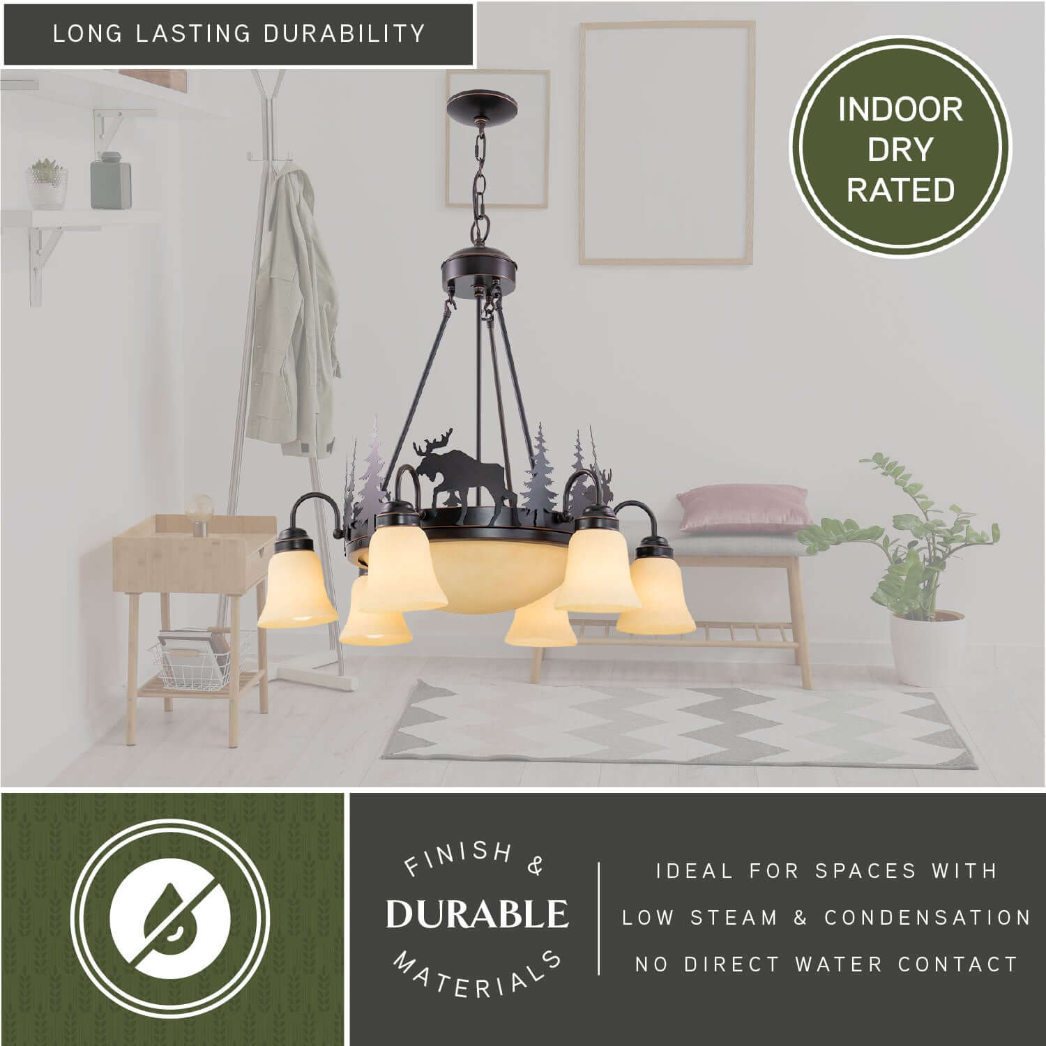 Evoking the spirit of the wilderness, this rustic themed light is clad in a burnished bronze finish and features silhouetted tree and moose imagery atop glowing amber flake glass. It is a great choice for a vacation lodge, cabin or suburban home and will complement a variety of home styles: anywhere you want to bring an element of nature. This chandelier is ideal for kitchens, dining areas, and foyers.