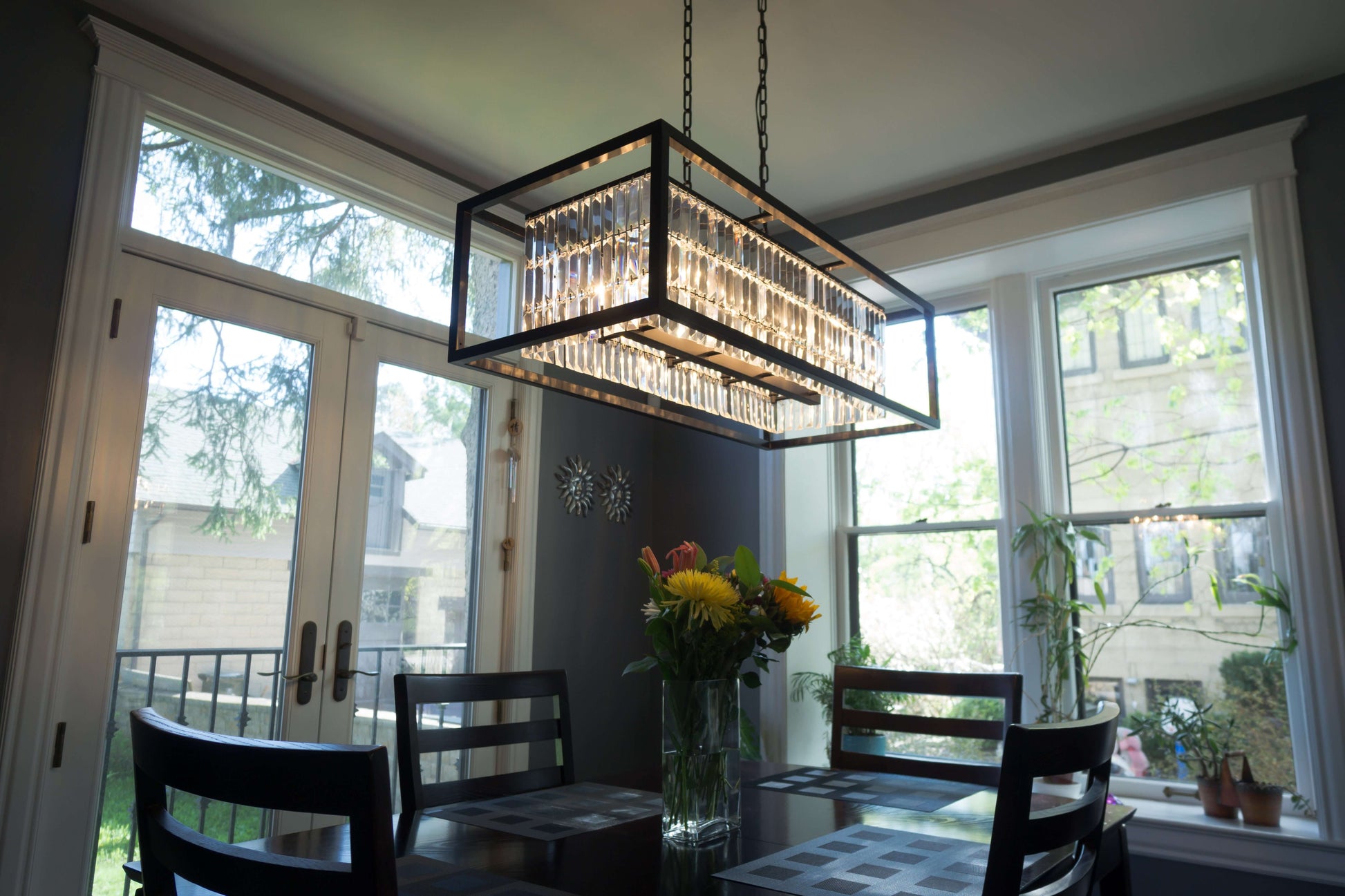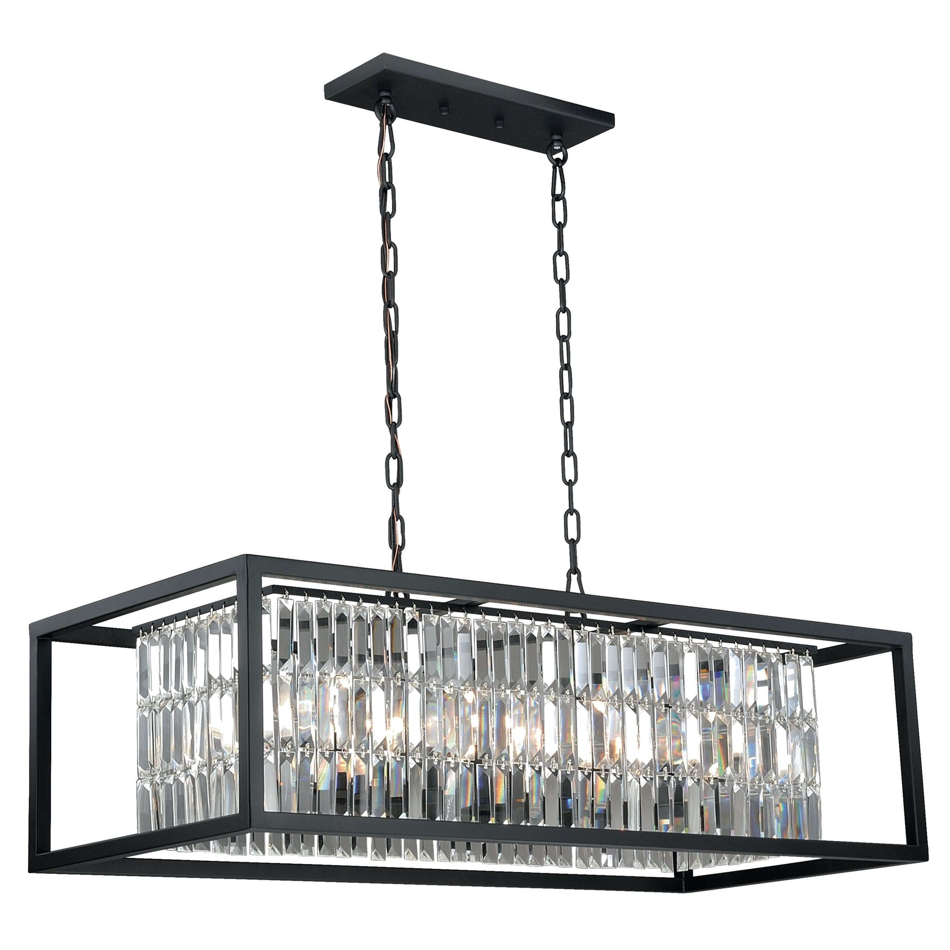 This collection brings the idea of a crystal chandelier into a whole new light. The Catana collection marries the boldness of oil rubbed bronze with the delicacy of crystals to enhance any décor. It seamlessly brings together traditional, transitional, and contemporary concepts into one brilliant fixture. Suitable for urban loft spaces as well modern rooms, this versatile style would be a statement piece in your home. This rectangular chandelier has suspended, faceted glass crystals housed in a bronze drum cage. Surprisingly neutral and versatile for over a kitchen island or over a dining room table. The rectangular footprint of this piece will complement oval or rectangle dining room tables.