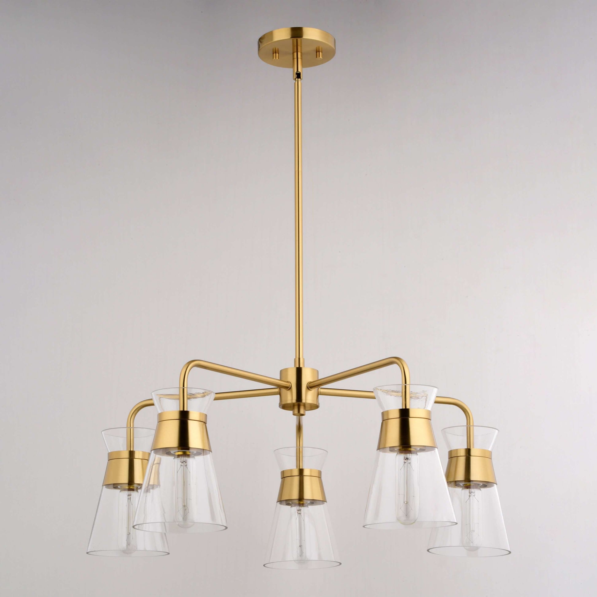 Indulge in mid-century modern charm with the Harper 5 Light Chandelier. Its sleek, bowtie-inspired design and natural brass finish bring a touch of warmth and sophistication to your dining room, living room, or foyer. The clear glass shade beautifully showcases your choice of bulb, creating a captivating focal point