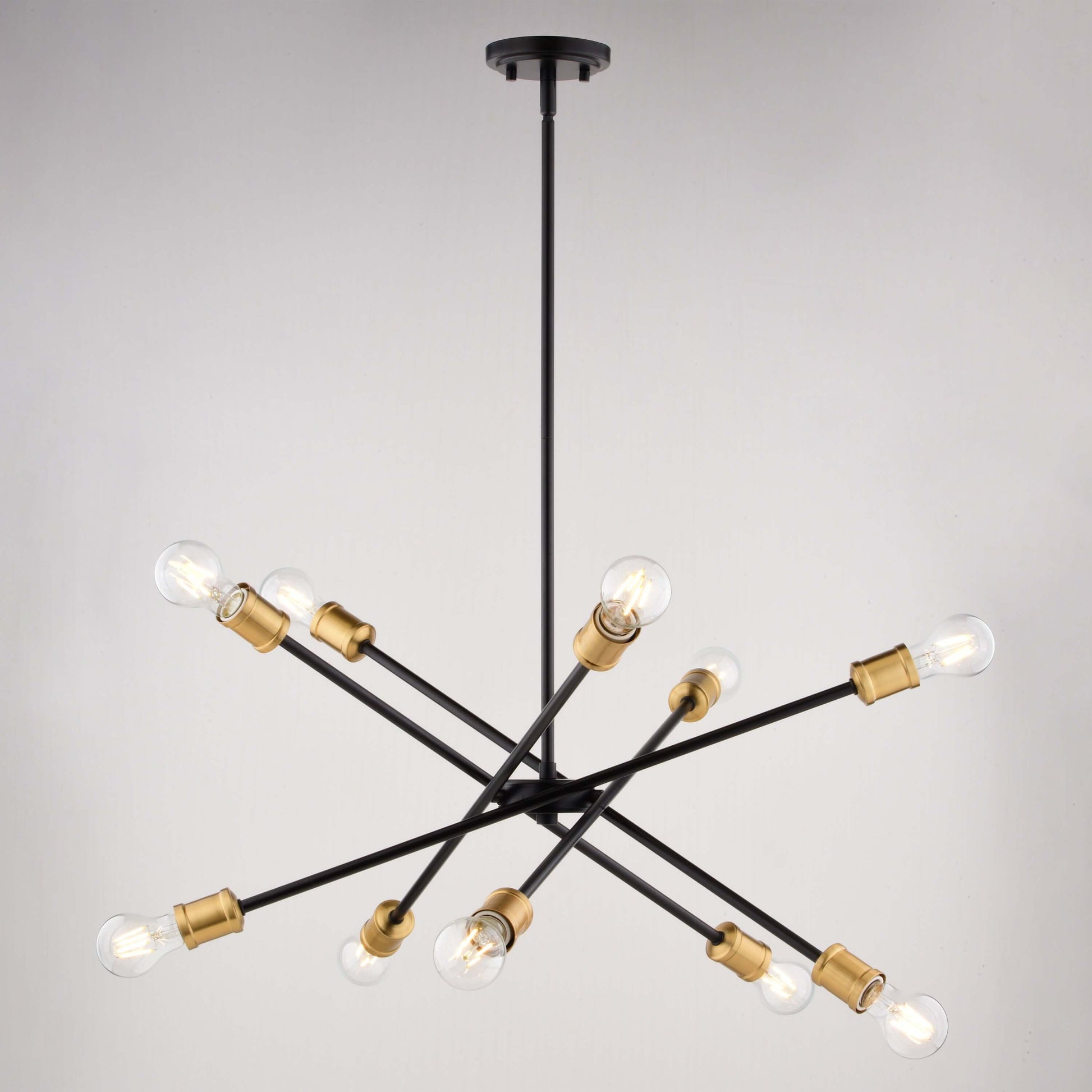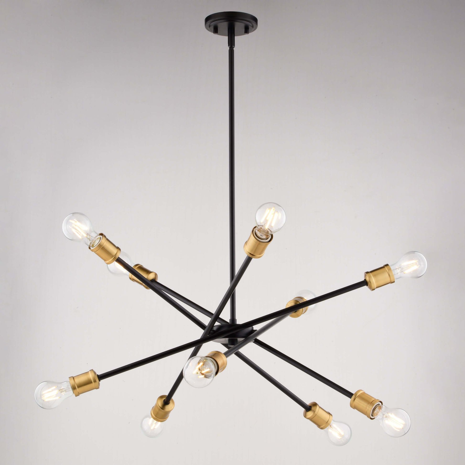 Experience the allure of timeless elegance with the Gresham Chandelier, a mid-century modern marvel that will redefine your space with its classic sputnik silhouette and striking two-tone finish. The matte black arms with antique gold contrasts, create a dramatic visual statement, perfect for adding a touch of sophistication to your dining room, living room, or foyer.
