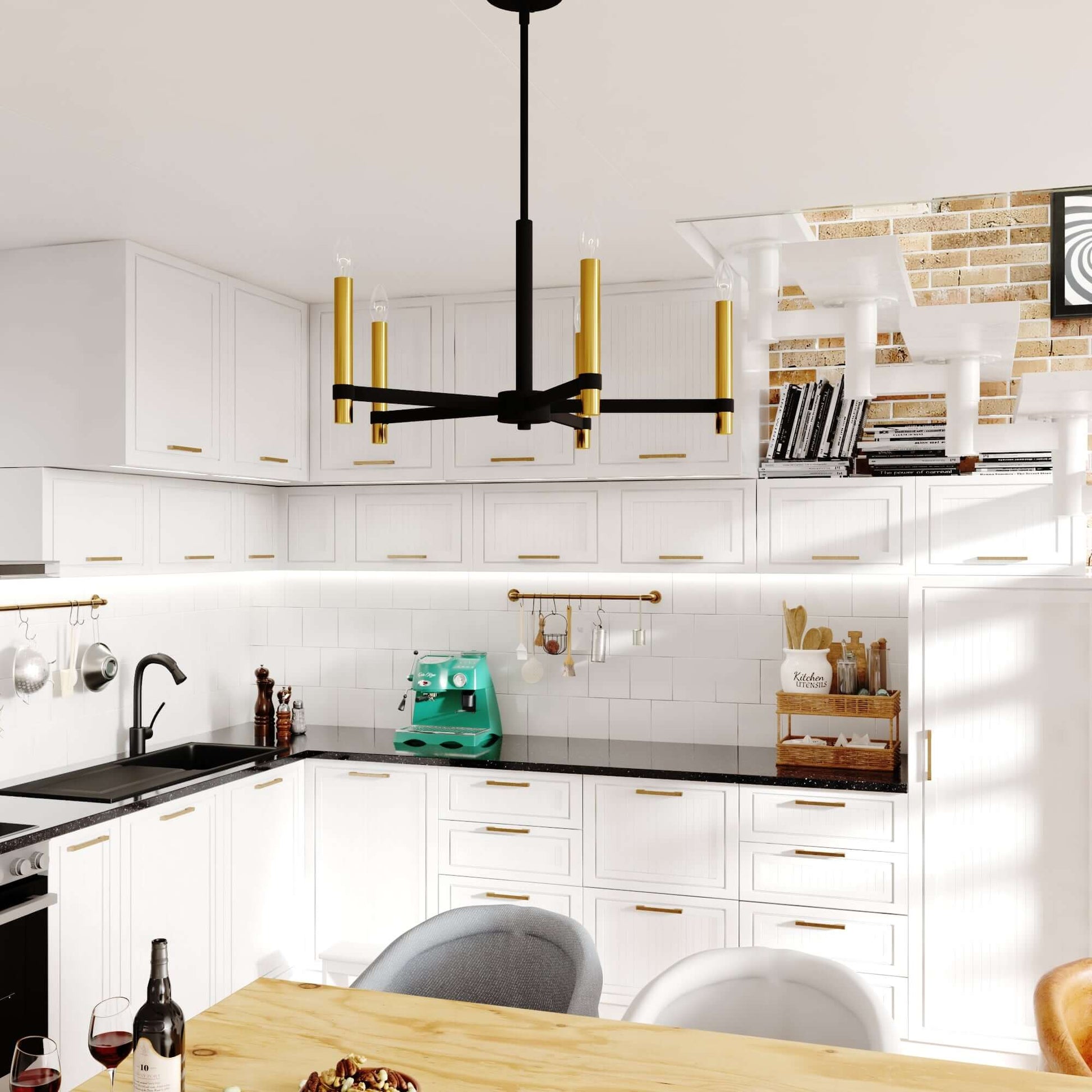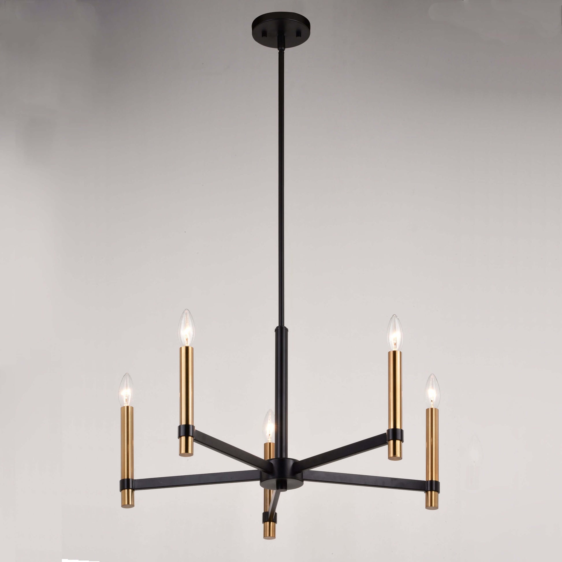 Slim and sleek defines this collection called Damen. Minimalistic styling is epitomized in this matte black and natural brass ceiling mounted collection, with no glass or frills to detract from the striking impact it will bring. This beautiful chandelier is ideal in any living area, dining, or kitchen.