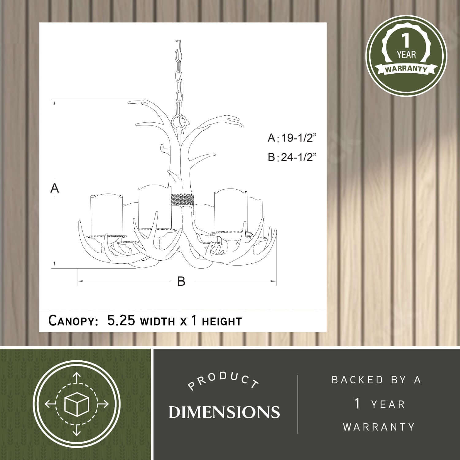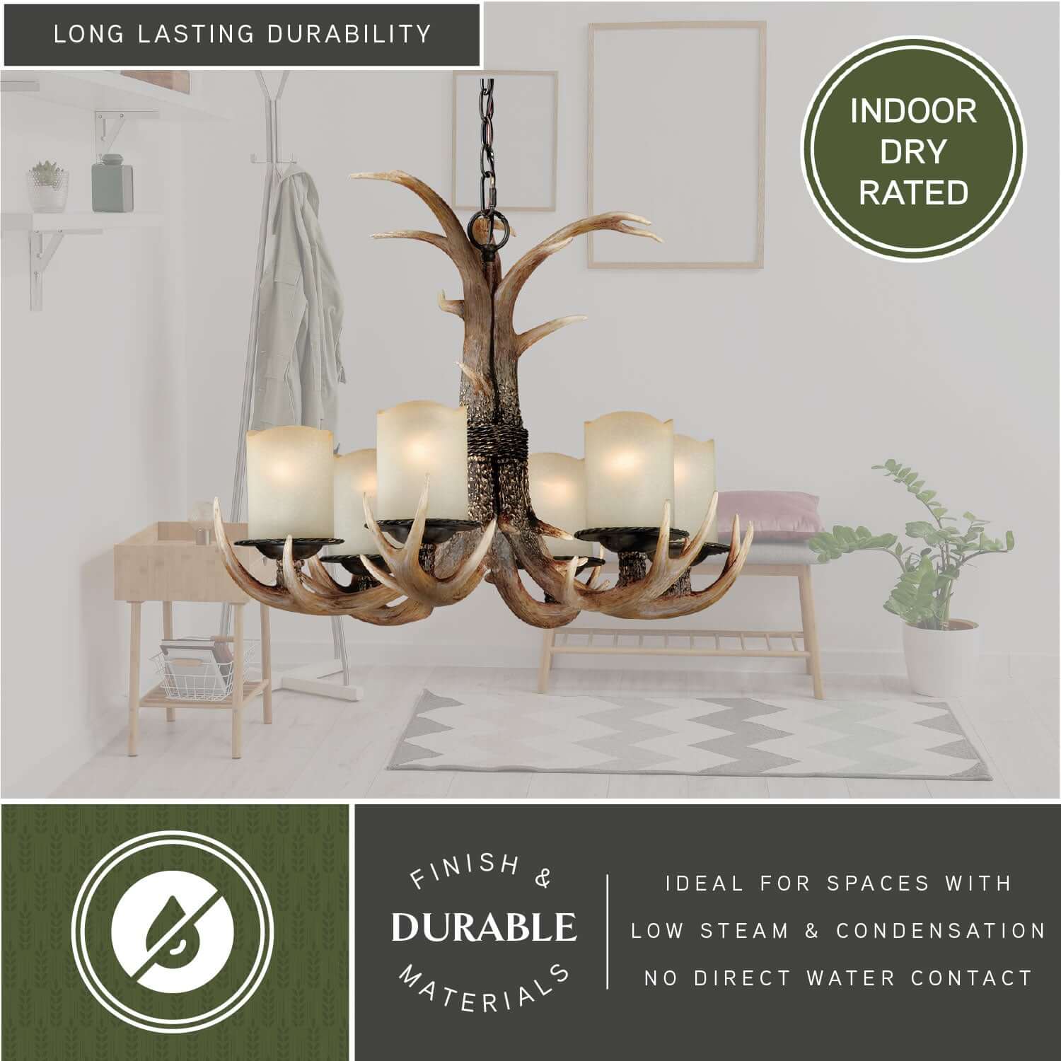 Evoking the spirit of the wilderness, this rustic themed light is clad in a black walnut finish and features crème cognac glass. It will complement a variety of home styles bringing an element of nature indoors. The Yoho collection features reproduction deer antlers making it a great choice for a vacation lodge, cabin or suburban homes. This chandelier is ideal for kitchens, dining areas, and foyers.