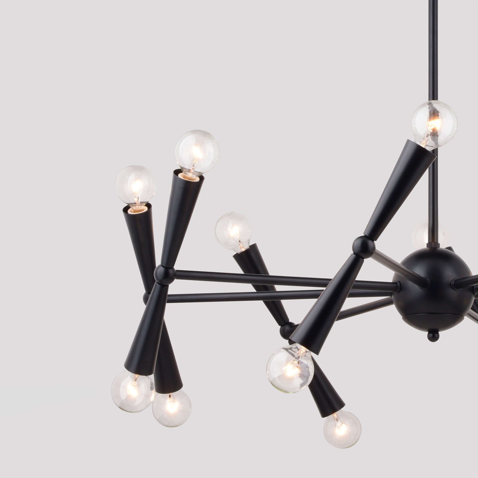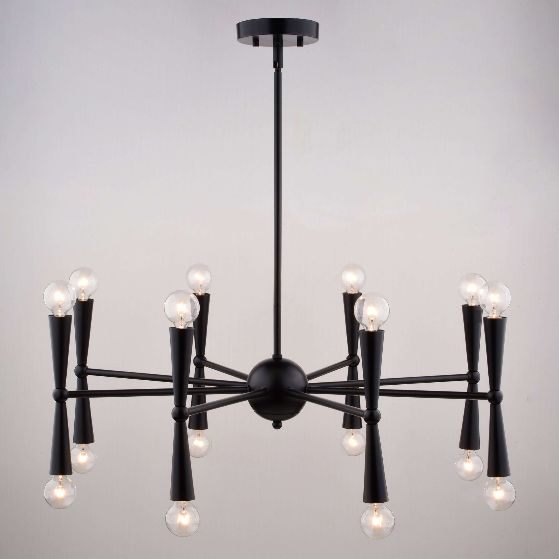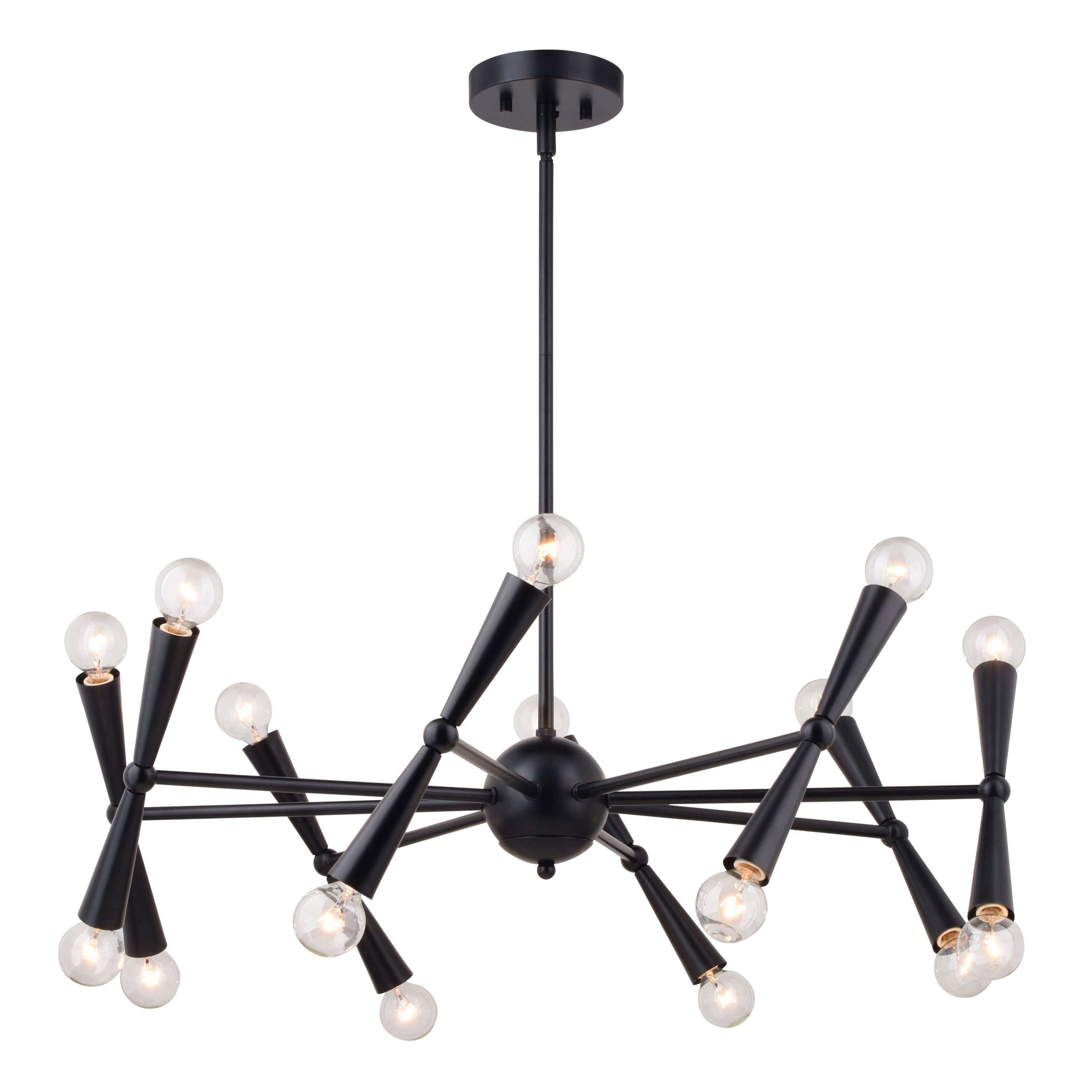 The Drake 29-in. chandelier is a playful homage to mid-century modern design. Rotating outer arms for customisable ambiance with its 16 lights and the striking matte black finish completes the overall look. Perfect for dining rooms, living spaces, bedrooms or home offices seeking a touch of retro-chic charm.