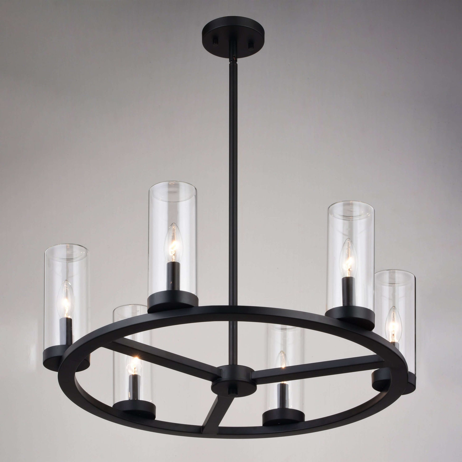 The Grantley collection is the perfect addition to your indoor or covered outdoor spaces. Long clear glass cylinders accentuate the clean, simple transitional styling of this collection. A ring with metal discs in a striking matte black finish supports the glass cylinders showcasing a generous display of light. Add this chandelier light to any dining, living or covered outdoor space where a little extra light is needed to add a stylish touch.