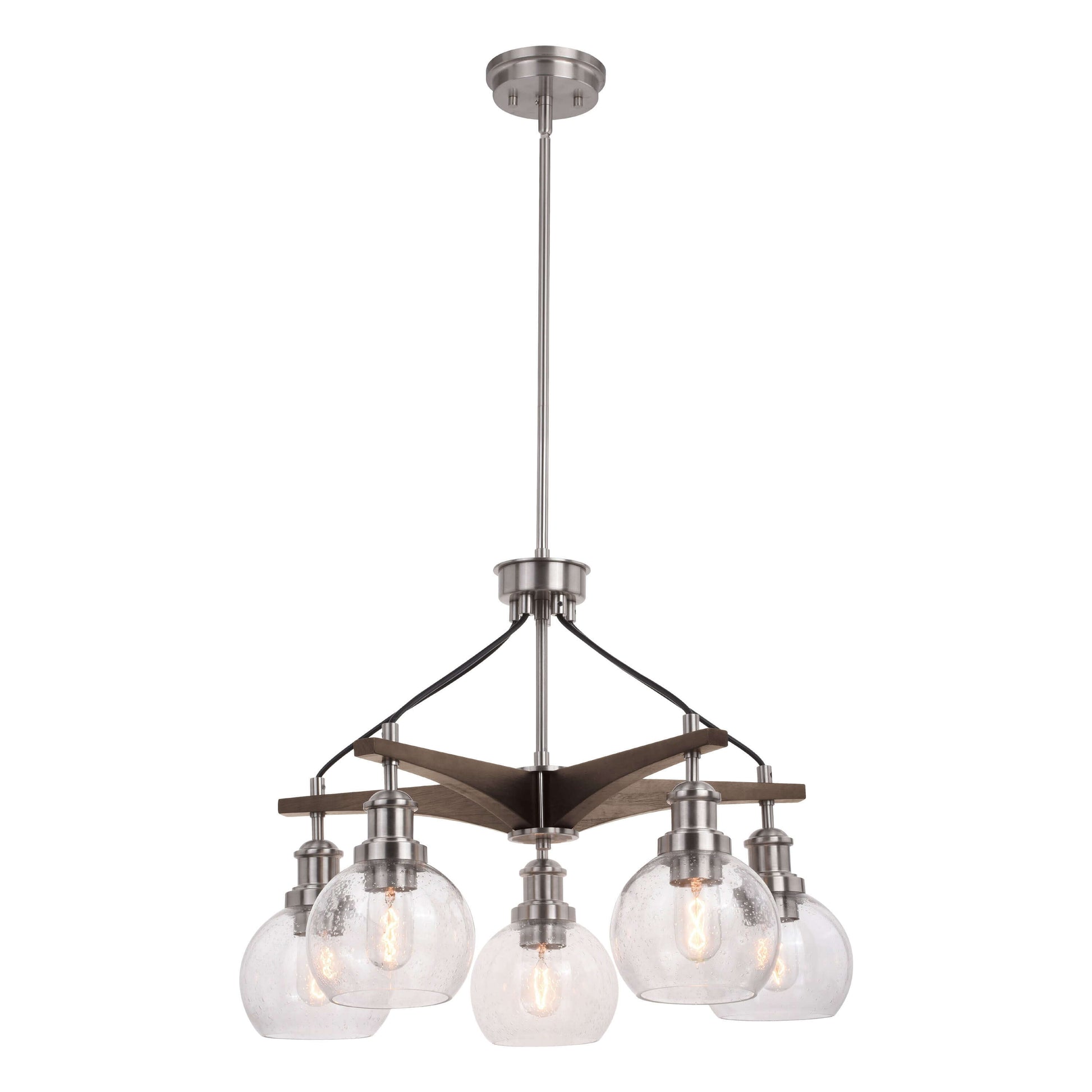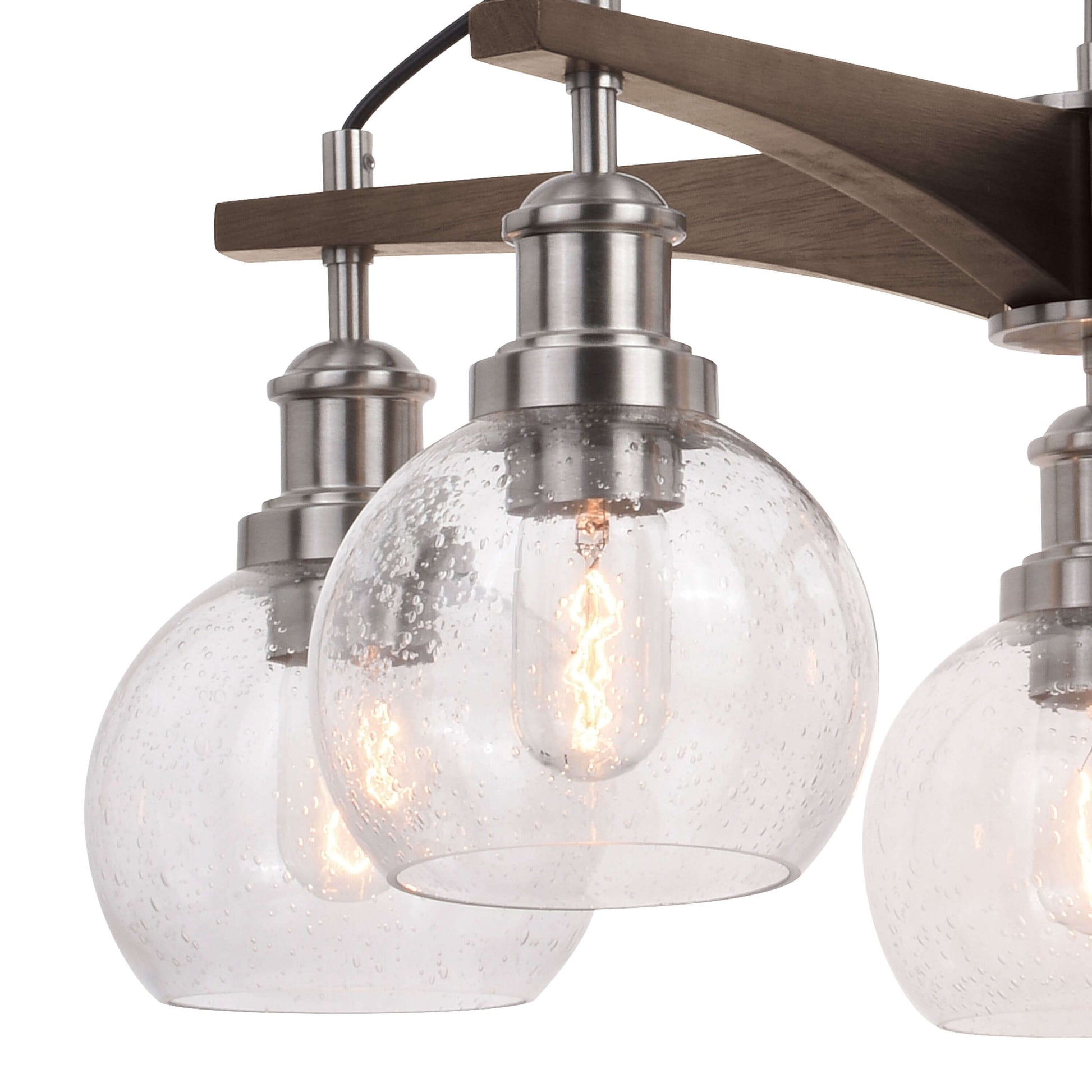 We revisited the on-trend style of modern farmhouse lighting with the Avondale collection. The mix of warm natural wood and cool light materials combine to create a delicate balance between farmhouse, modern and transitional decor. This hanging ceiling light has sculpted arms of rustic wood that radiate out from a slim central column of satin nickel. Clear seeded glass globes dangle from each arm creating a captivating combination evoking a feeling of warmth and comfort. This chandelier will complement a variety of spaces including dining rooms, kitchen islands, bedrooms, foyers, entryways, living rooms, and more. Coordinate the look with the matching wall light fixture.