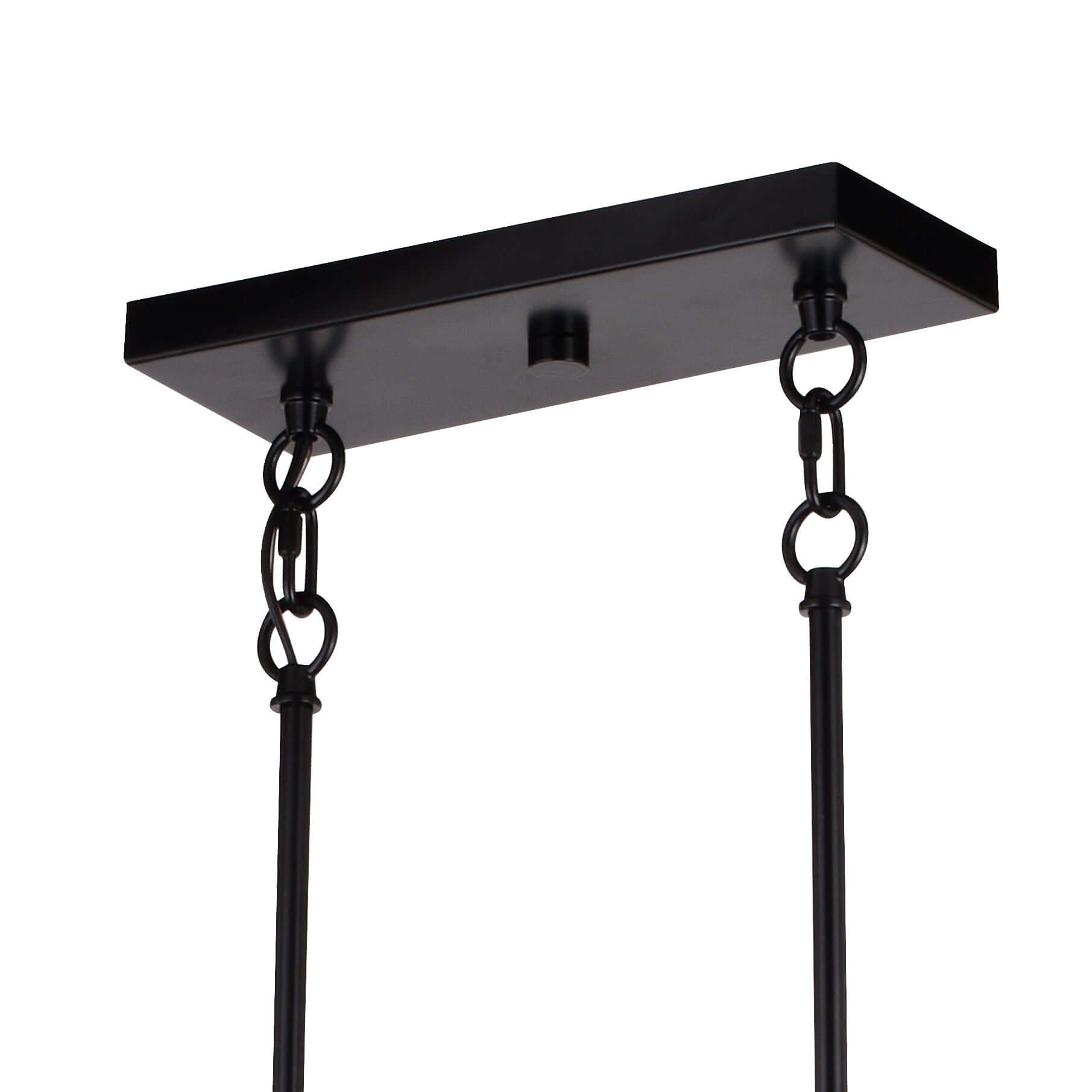 Warm, rustic overtones are realized in the collection called Wade. Matte black bands of metal crisscross between two floating frames of solid sycamore wood. This tapered basket-like design hangs proudly from two slim black supports, capturing five large bulbs that sit in a perfect row. This linear chandelier will bring a warm glow to any dining, island or living space.