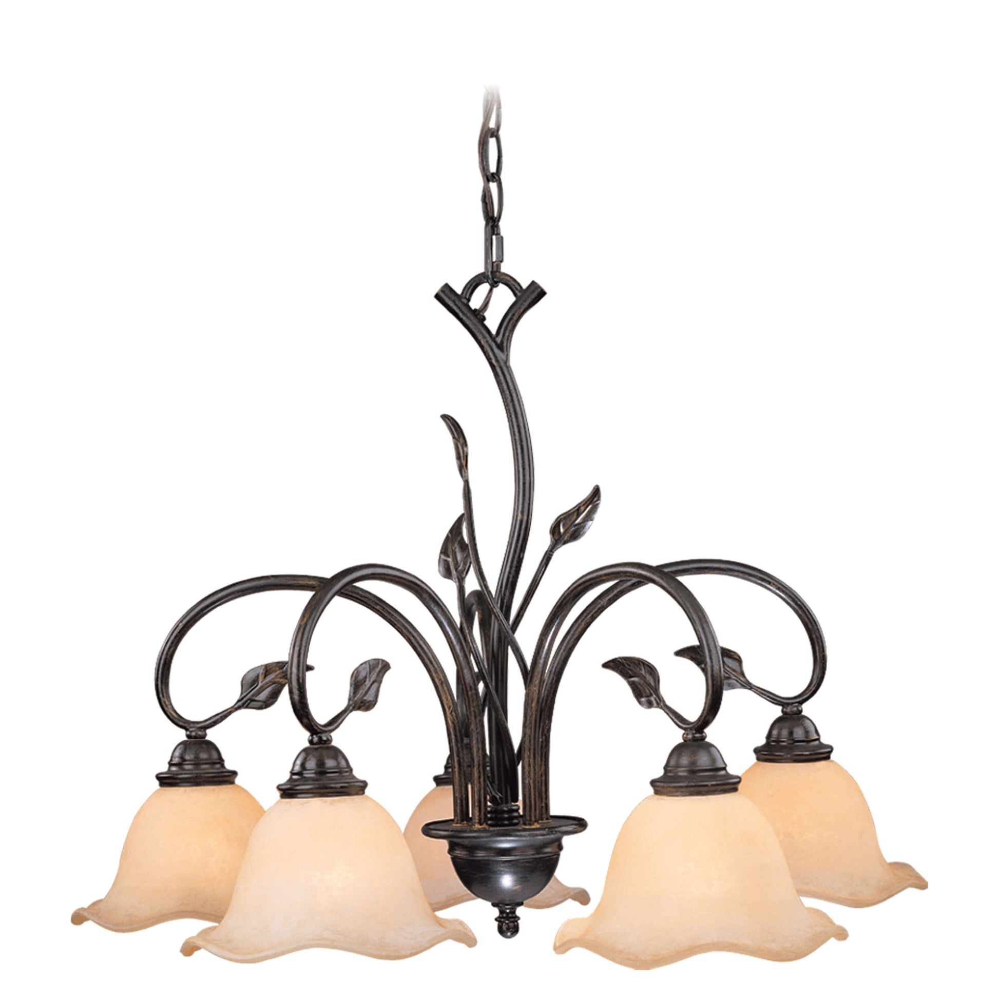 Bring a little of the outdoors inside with the Vine collection. Inspired by nature, this rustic collection features a dark oil shale finish. The amber flake glass shades are scalloped softening the overall feel. Elegantly curved arms are sprinkled with delicately crafted leaves completing the look. This full family of fixtures has something for every room in your home. This chandelier is ideal for kitchens, dining areas, and foyers.